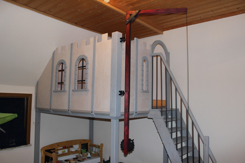 Eine stabile Vollholztreppe, ein schwenkbarer Kran und