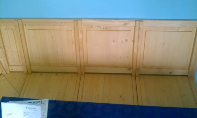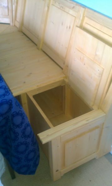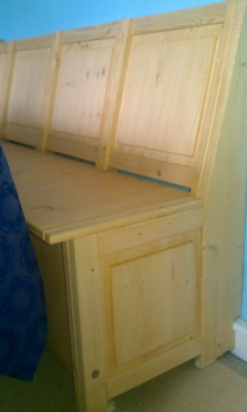 Klassisch gebaut mit Rahmen und Füllungen und mit großem Stauraum versehen ist diese Bank schön und praktisch zugleich.