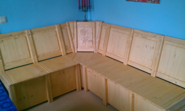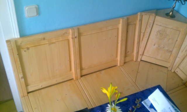 Die Eckbank wurde aus einzelnen Elementen zusammengesetzt. Dadurch ist sie sehr flexibel und kann neuen Raumsituationen problemlos angepasst werden.